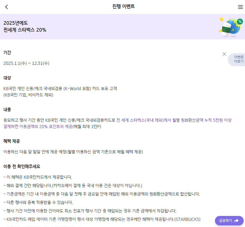 (1) 해외 스타벅스 20% 포인트(KB포인트리) 캐시백 : ~2025.12.31