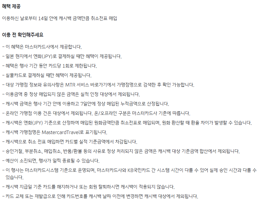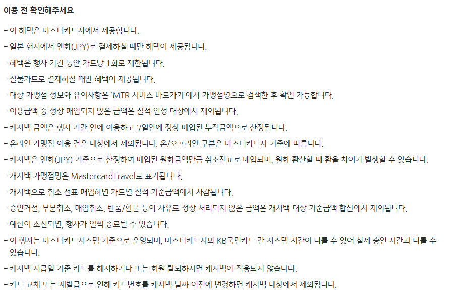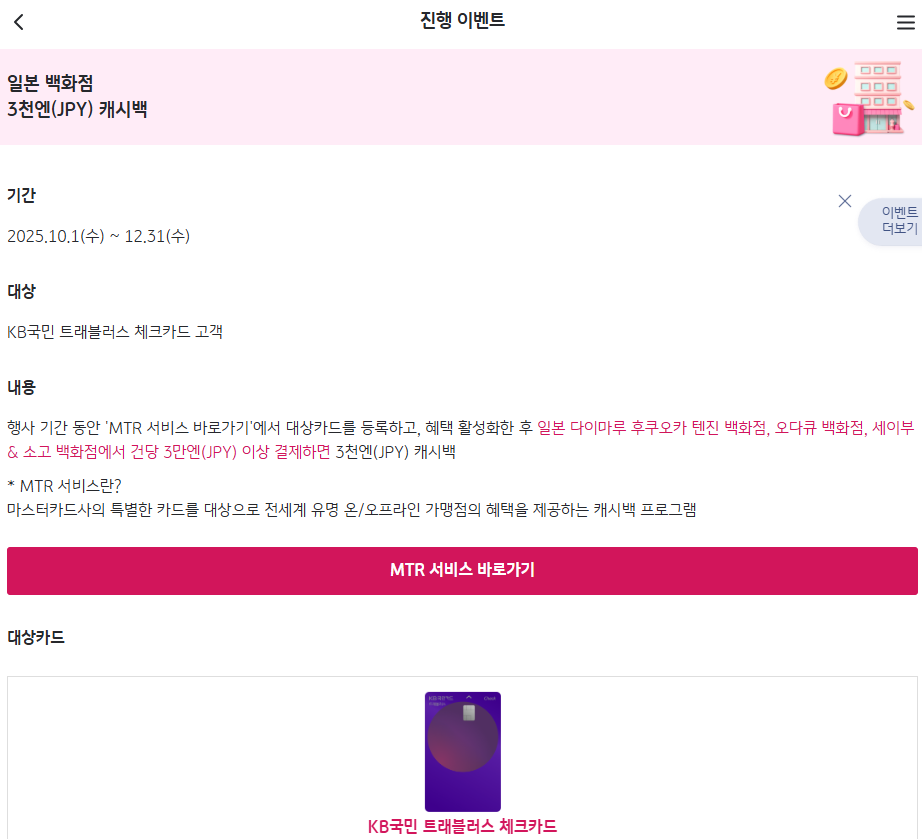 - 요약 : MTR 활성화 후 KB국민 트래블러스 체크카드로 텐진 백화점에서 30,000엔 이상 결제 시 3,000엔 캐시백