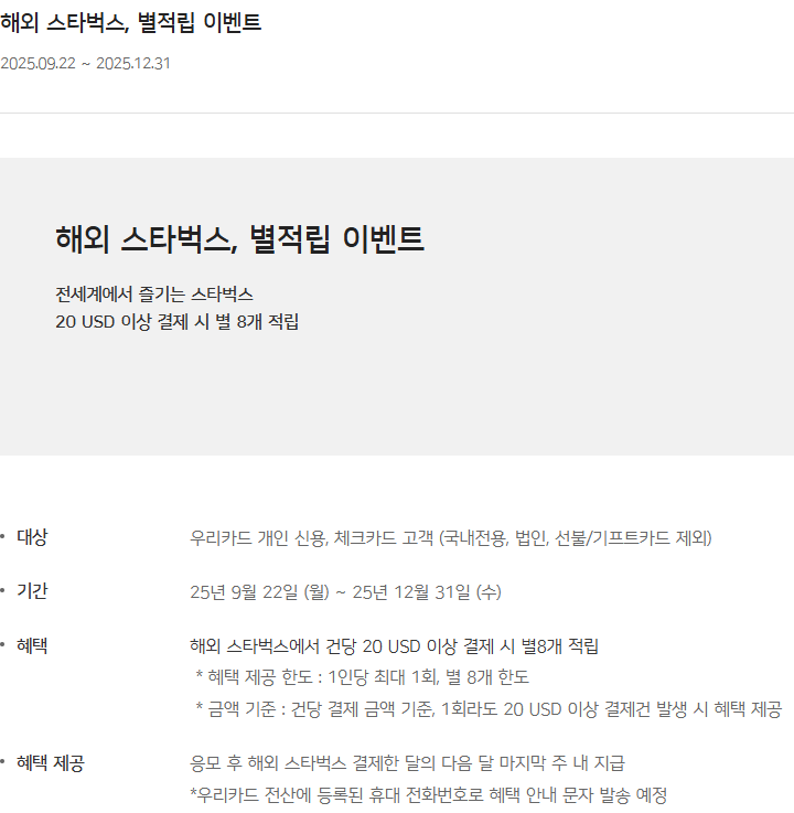 - 요약 : 응모 후 우리카드 신용/체크카드로 해외 스타벅스에서 $20(약 3,055엔) 이상 결제 시 스타벅스 별 8개 적립
