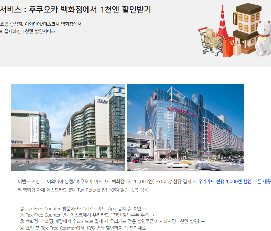 - 요약 : 우리카드로 이와타야/미츠코시 백화점에서 10,000엔 이상 결제 시 1,000엔 할인 쿠폰
