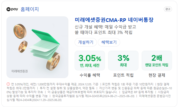 | 파킹통장 추천, 미래에셋증권CMA-RP 네이버통장 (0) | 2025.01.11 |