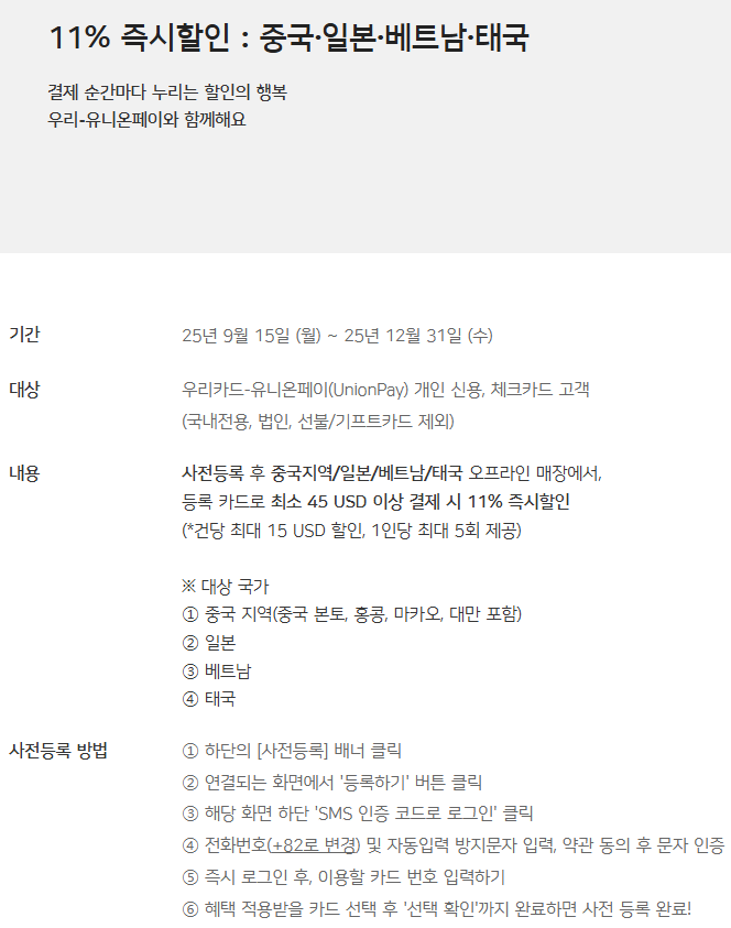 - 요약 : 우리 "유니온페이(UnionPay)" 신용/체크카드로 $45(약 6,873엔) 이상 결제 시 11% 할인 5회