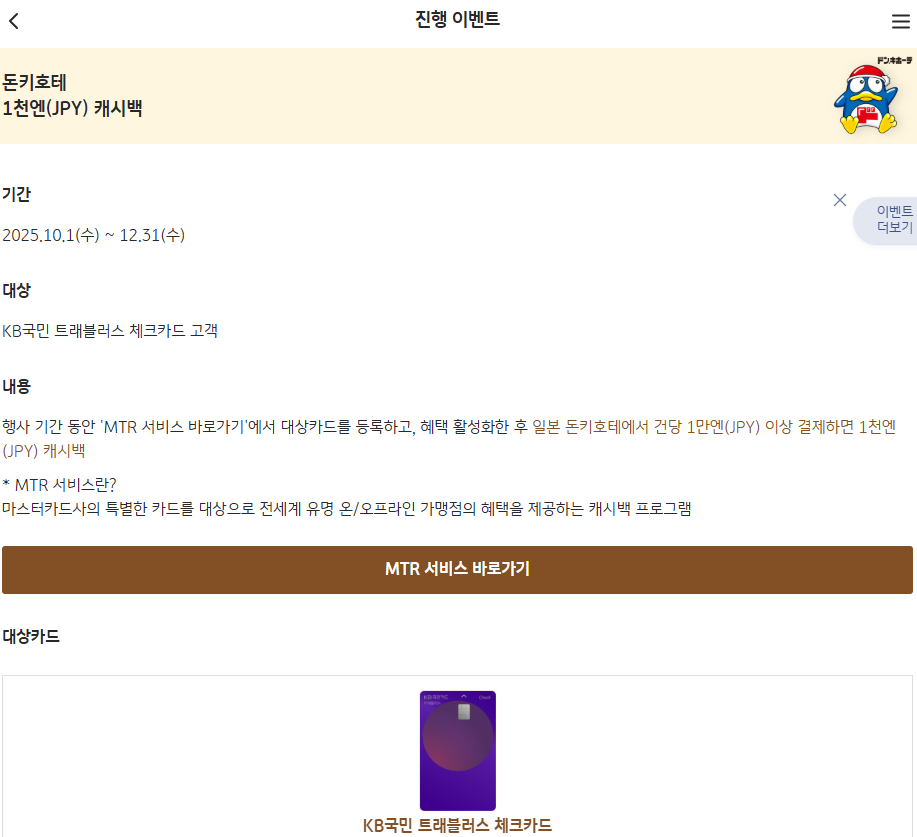 - 요약 : MTR 활성화 후 KB국민 트래블러스 체크카드로 돈키호테에서 10,000엔 이상 결제 시 1,000엔 캐시백