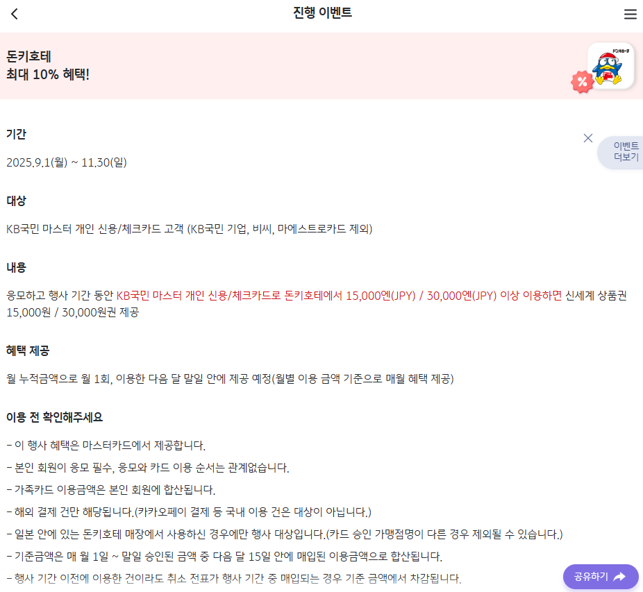 - 요약 : 응모 후 KB국민 "마스터(Master)" 신용/체크카드로 돈키호테에서 15,000엔/30,000엔 이상 결제 시 신세계 상품권 15,000원/30,000원 캐시백